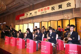 国歌斉唱の後、 木原敬介堺市長、 海上自衛隊阪神基地隊司令 志賀洋介海将補が、 それぞれ祝辞を述べた。 中華人民共和国駐大阪総領事館副総領事 葛廣彪氏、 在大阪インドネシア共和国総領事館副総領事 パトリオットアディナルト氏、 台北駐大阪経済文化弁事處 處長呉嘉雄氏など450人がお祝いにかけつけた。 また、 加藤均氏の母校である学校法人神港学園 神港高等学校ジャズオーケストラが応援に駆けつけた。 同オーケストラは、 ジャズの振興と阪神淡路大震災の復興を願って、 1995年に結成。 数多くの演奏を繰り返し多くの人に親しまれている。 「ブルートレイン」、 「星影のステラ」、 「テイクファイブ」 「ワンオクロックジャンプ」 などを演奏し、 会に花をそえた。 |