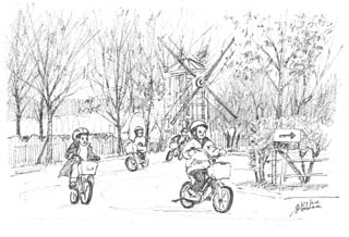| 寒風のきつい冬晴れの中、 ワー走る!走る!幼い子どもが、 自転車を走らせている。 「よそ見をするな」 あっ、 転んだ。 「泣いたらあかん!頑張れ。」