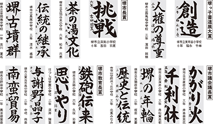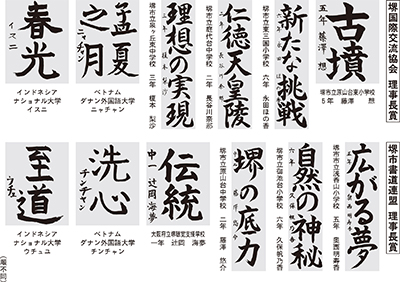 審査委員 堺市教育委員会 堺市書道連盟 池 容子、一播筌恵、稻谷紀洸、上田好子、大代香園、奥野勝美、尾野尉子、神田里奏、倉橋剛太郎、久保聖翠、近藤心華、酒井冬石、住谷幸紀、副島竹内美紗子、田端芝蘭、玉置洸佳、田村梅翠、塚本泉香、中植美智子、仲林紅範、長尾静萌、納谷笙楓、西尾曹溥、唄 洸道、花谷禎子、東野明秀、廣崎叡泉、藤岡幸子、松元紫仙、森崎洸裕、安井翔玉、吉田良子、和喜田恵洸、渡辺彩洸